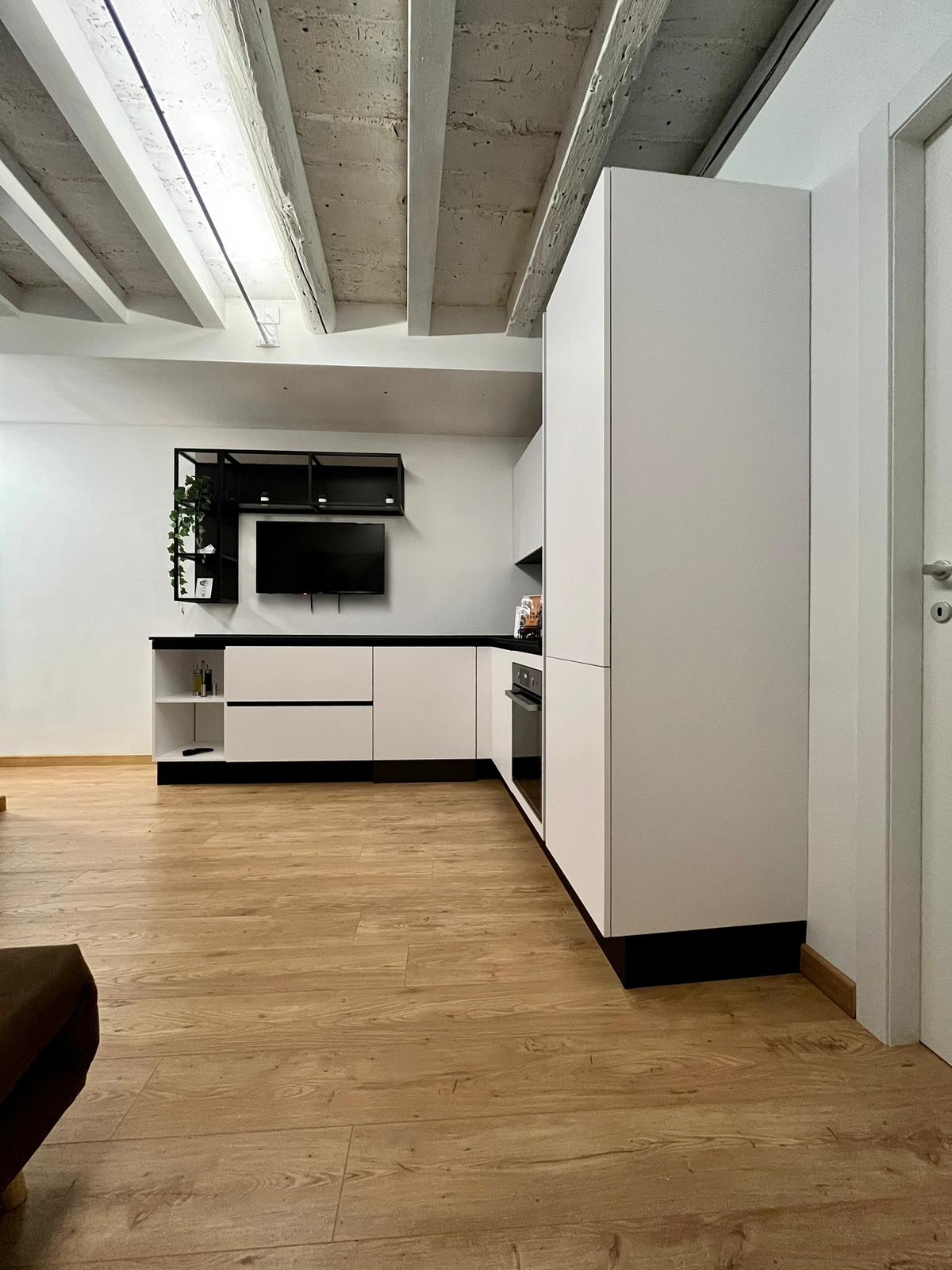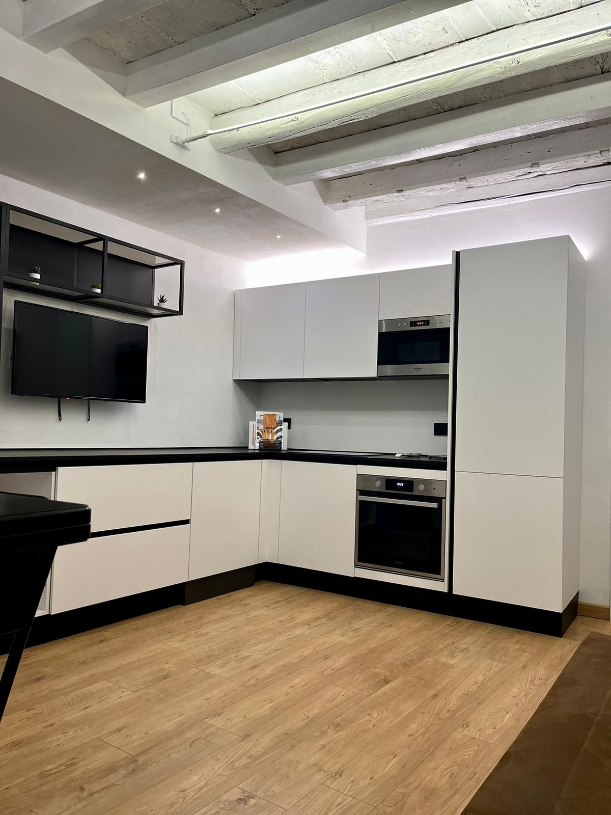 Appartamento elegante e moderno in un contesto storico, con travi a vista e tutti i comfort, inclusa cucina attrezzata e divano letto per ospiti extra.